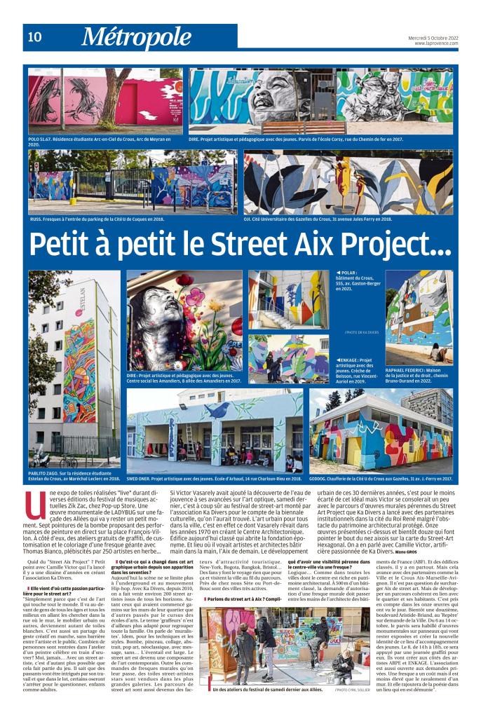 Dans le cadre de « Une 5ème saison« , Biennale d’Art et de Culture d’Aix-en-Provence, et en partenariat avec les Allées Provençales, Ka Divers organise le Festival Street Art à partir du 24 septembre 2022.
