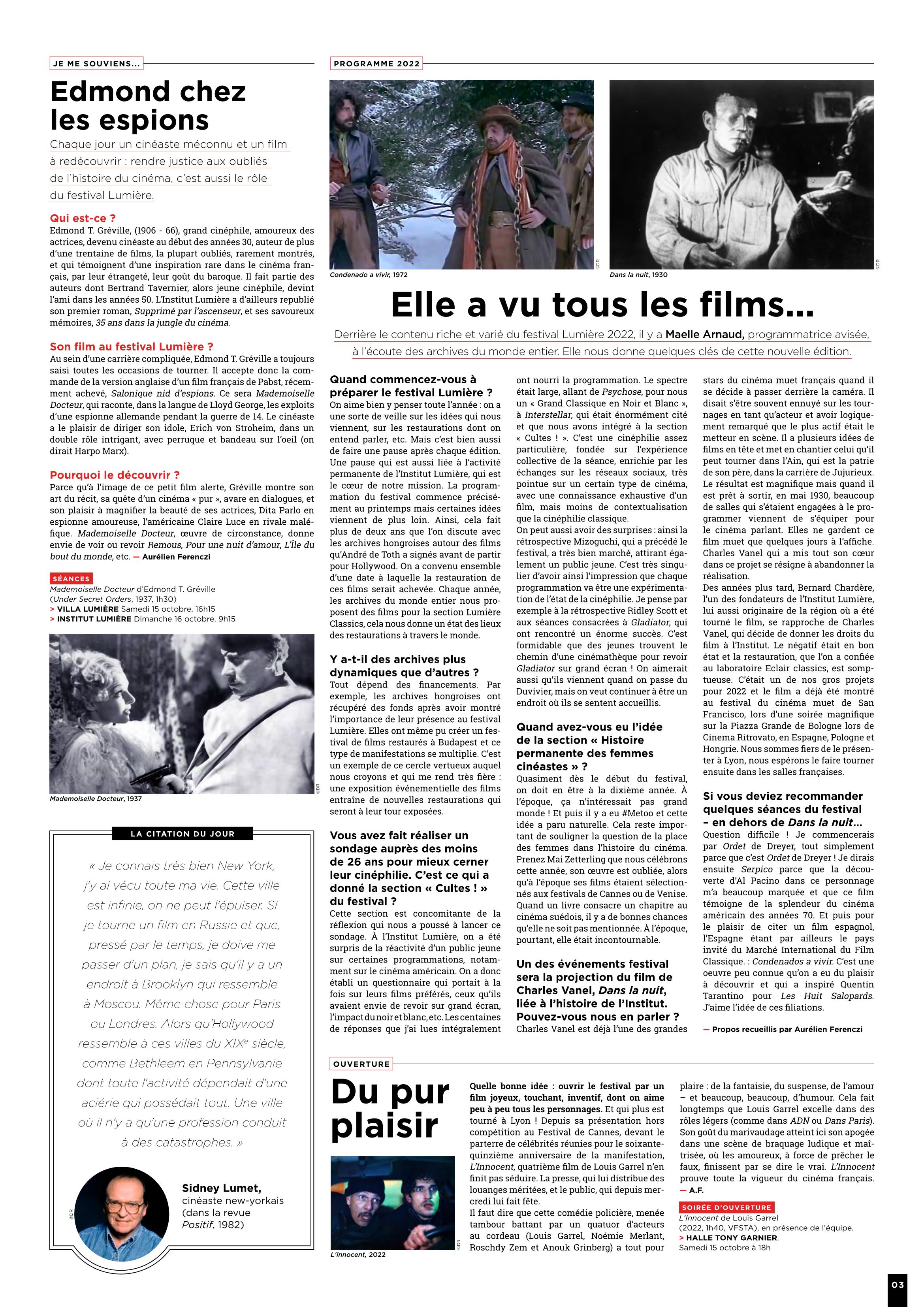 Journal du Festival LUMIERE de Lyon – 01 – 151022 – Samedi -.