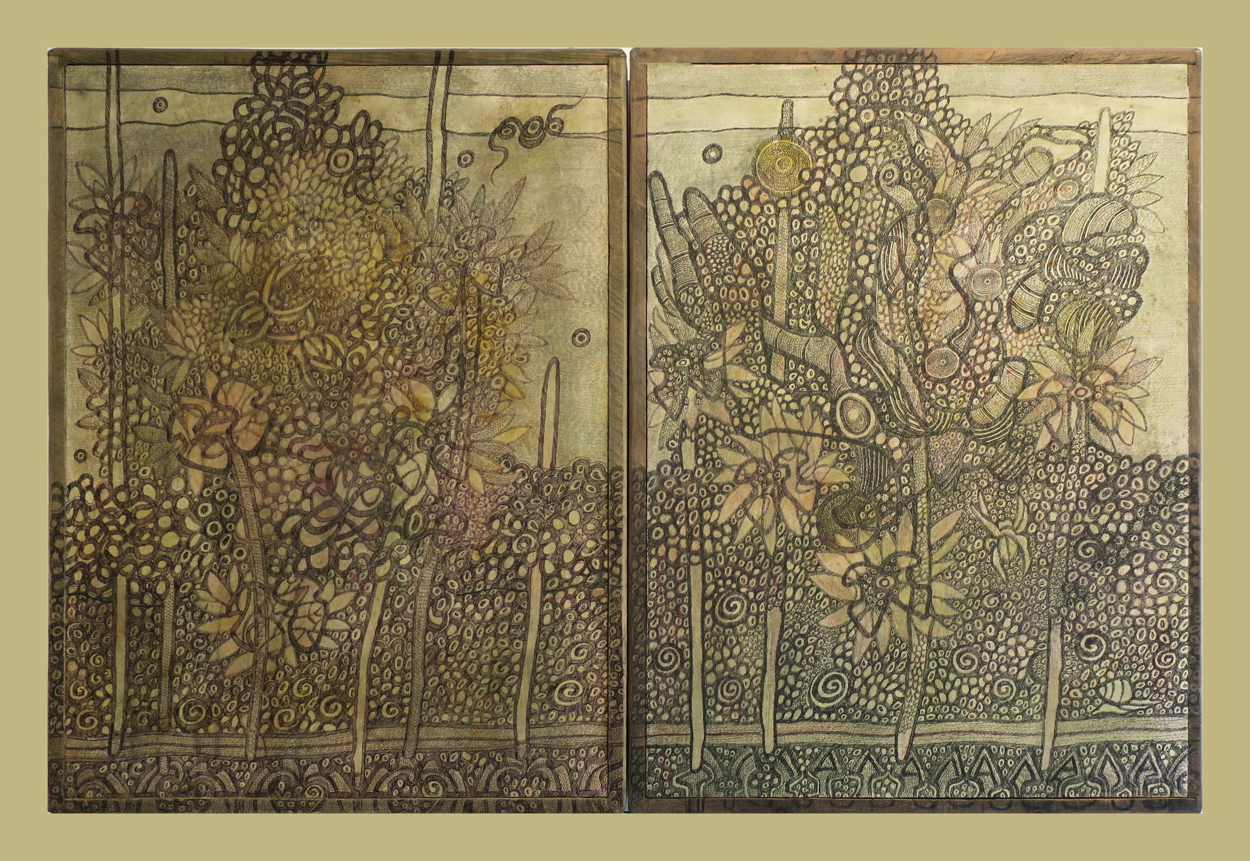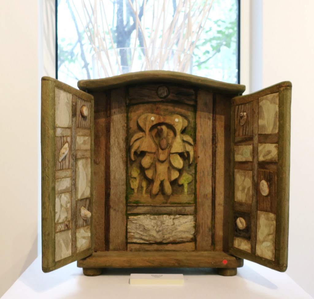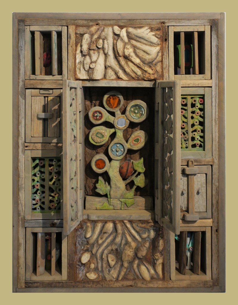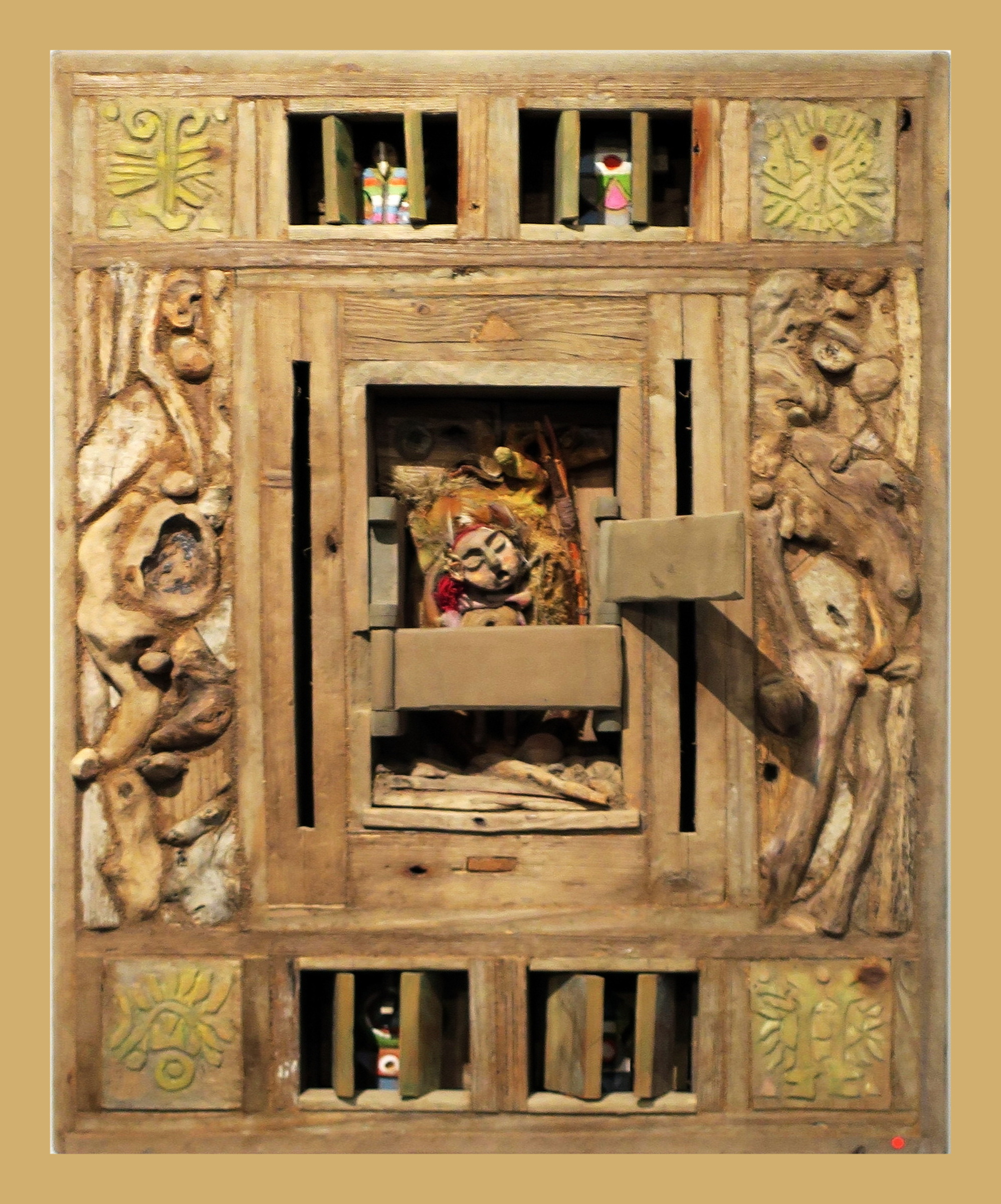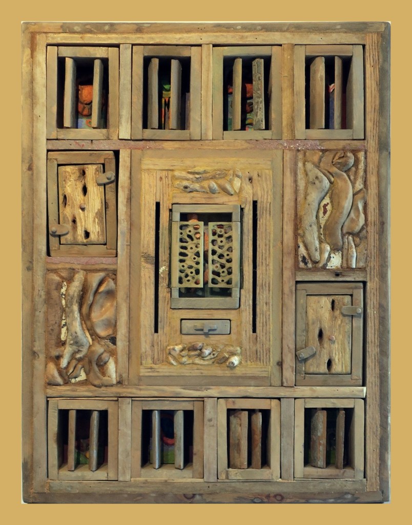 Assemblages en patchwork de bois flottés, les premiers objets de Pascal Verbena, sculptés avec des outils confectionnés par lui-même, étaient pour la plupart des oeuvres à mécanismes (portes qui s’ouvrent ou coulissent, tiroirs, volets, caches et cavités diverses, boules tombant dans des conduits). D’étranges créatures y semblaient retenues prisonnières (monstres antédiluviens, petits poupées de bois au regard effaré) d’où son appellation » Habitacle » à ses oeuvres atypiques exposées à l’Atelier Jacob à Paris en 1977, puis « Les Pondeuses » l’année suivante et enfin les « Retables ».