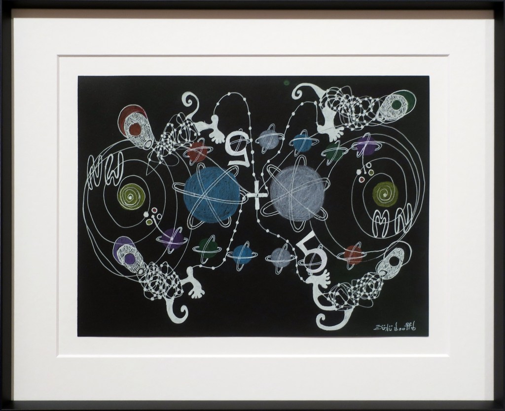 Féru de symboles et initié dès son plus jeune âge au langage des idéogrammes Akan, l’artiste tente de retranscrire le Boson, ou particule élémentaire de l’être en langue Akan, en faisant également référence au Boson de Higgs, la plus petite particule élémentaire en physique quantique.