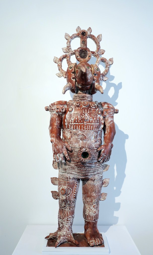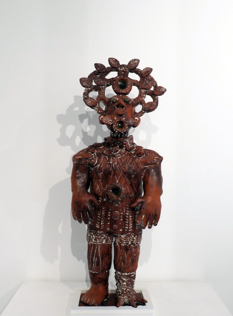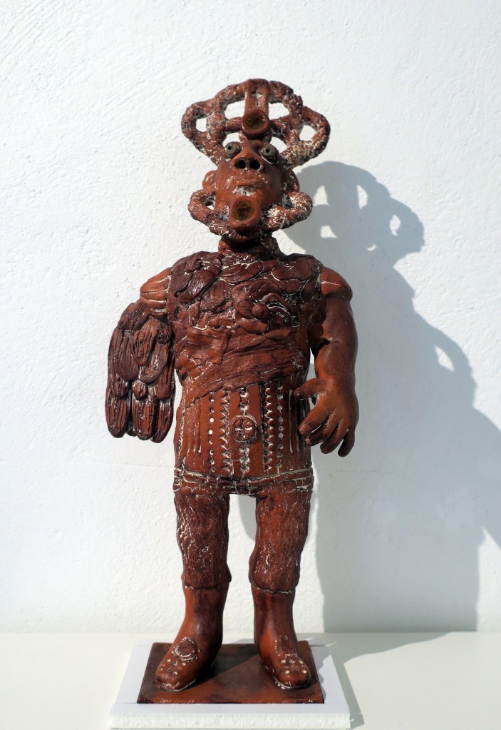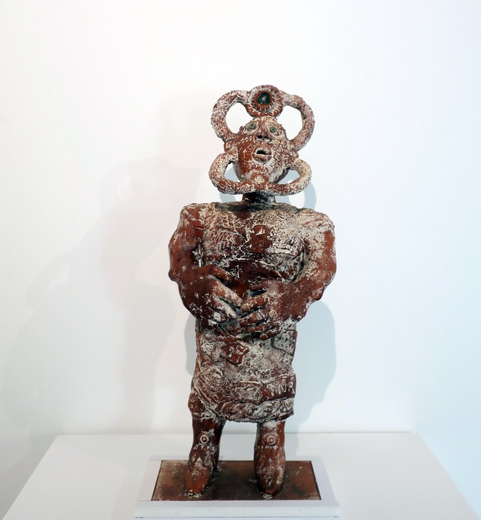 Artiste inclassable, il a été « adopté » selon ses mots, par la grande famille de l’art brut et de l’art singulier. Installé dans son atelier de Feurs (Loire), il utilise le matériel le plus simple possible, de la terre rouge, des jus d’oxyde de fer, de la terre blanche pour les ornementations. Avec quelques morceaux de vitraux fondus pour réaliser les yeux ou les médaillons.